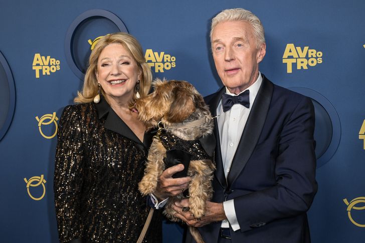 Niet alleen André van Duin, ook hondje Nhaan mocht Janny van der Heijden vergezellen tijdens het gala - geheel in stijl! Het duo pronkte met een matching glitter-ensemble. André had voor de gelegenheid een donkerblauwe smoking uit de kast getrokken. Awh!