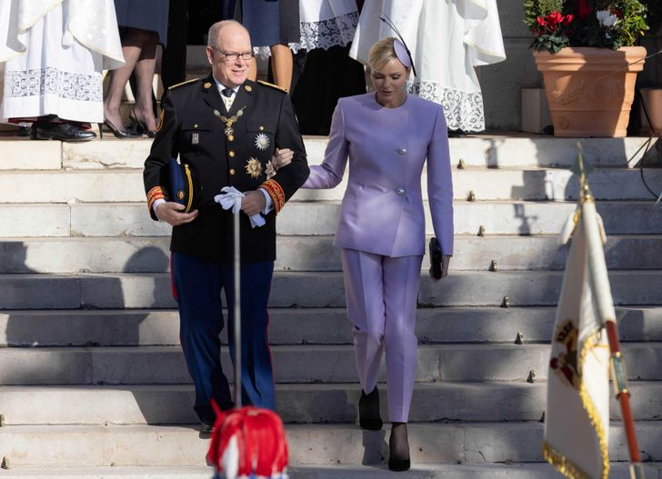 Afgelopen week stond Monaco in het teken van het Fête Nationale, waarbij de Doorluchtige Hoogheden het stralende middelpunt waren. Prinses Charlene trok daarvoor een prachtig lila ensemble van Louis Vuitton uit de kast, bestaande uit een pantalon, asymmetrische blazer én bijpassend hoedje. Een opvallende verschijning naast haar donker geklede man!