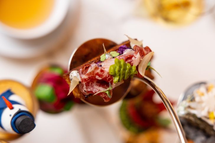 De feestelijke high tea gaat verder dan de standaard sandwiches. Begin met een verrassend luxe bite: de winterse "Oyster" met een delicate dennen‑infused dressing en een laagje geitenkaas. De perfecte mix van ziltig, winters en verfijnd. Of kies voor de fenomenale "Christmas Tree" van gerookte zalm met wasabi‑crème en tobiko‑parels: een knipoog naar traditie, maar dan modern en chic. Een waar kunstwerkje!