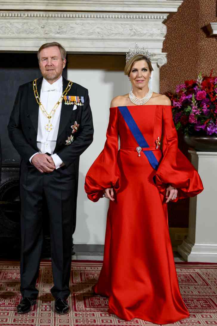 Koningin Máxima koos voor een vuurrode jurk met ballonmouwen van Claes Iversen, een ontwerp dat ze eerder droeg tijdens het staatsbezoek van de Franse president Macron, twee jaar geleden. Maar wat vooral opviel, was het Württemberg-diadeem – ook wel bekend als het bruidsdiadeem van prinses Beatrix.